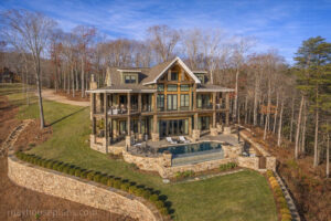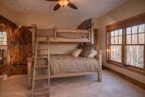 The first thing you notice as you enter the Asheville Mountain House is the beautiful wall of glass at the rear of the family room. A vaulted ceiling, a stone fireplace, and exposed timber beams give the family room a cozy mountain lodge feel. The kitchen, dining area, and family room are all open to each other and enjoy the same views. A mudroom, laundry room, and pantry are conveniently located just off the kitchen. The master suite is located on the main level and enjoys a private covered porch. The master bath features a soaking tub, a walk in shower, and a walk in closet.The upper level includes two bedrooms that each have a walk in closet and a private bath. Each upper bedroom features a dormer overlooking the rear views. These dormers are sized so that a regular size mattress can be placed in them creating an over sized window seat/bed if the owner chooses. An open loft overlooking the family room connects the upper bedrooms. The lower level can be finished with a recreation room, a wet bar, a hall bath, and girls and boys bunkrooms. A workshop and lake storage is also a possibility on the lower level.