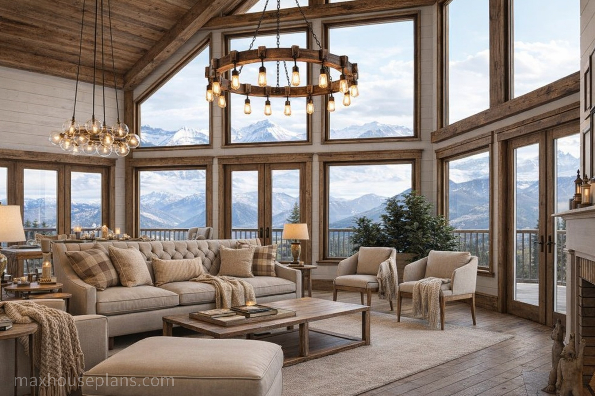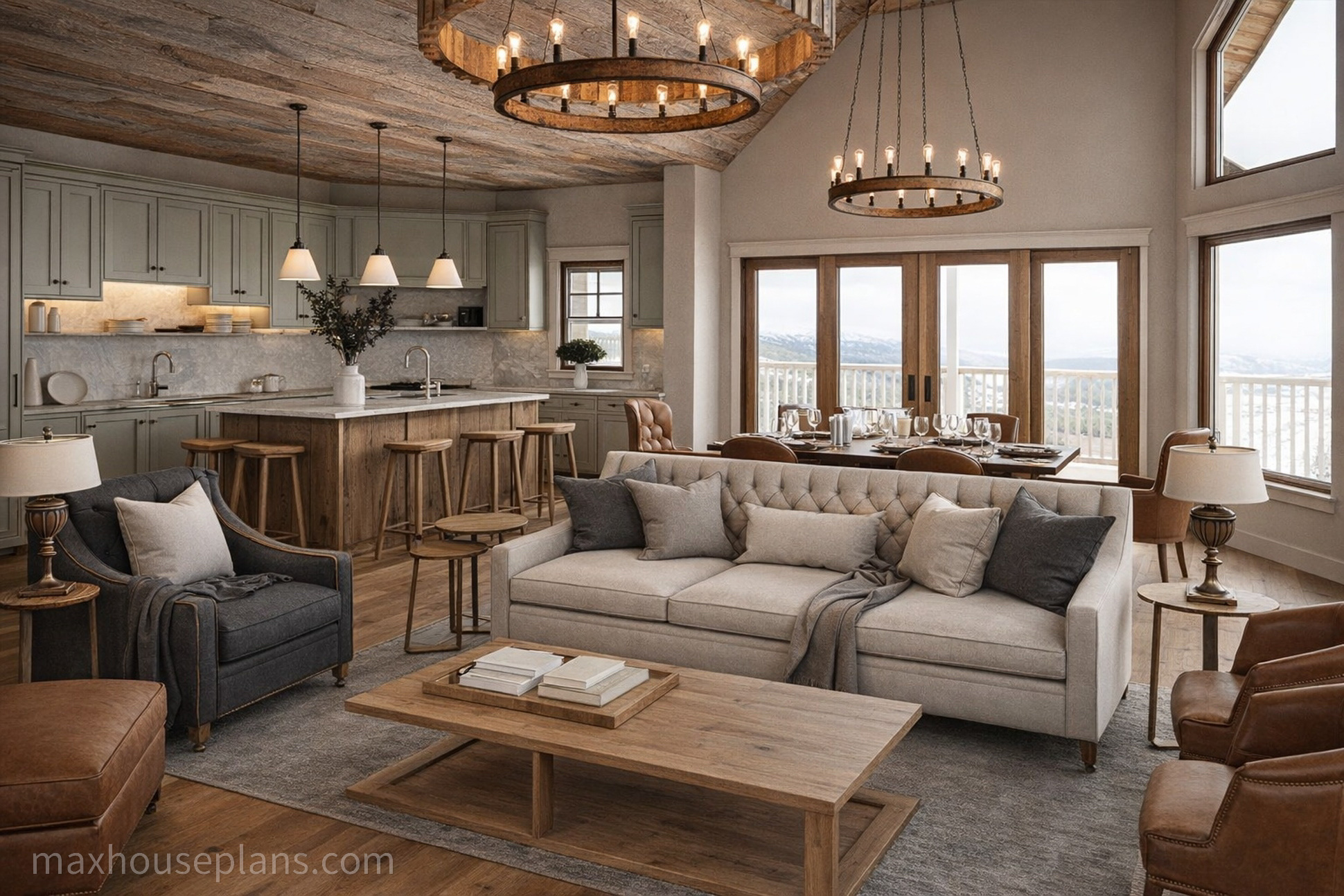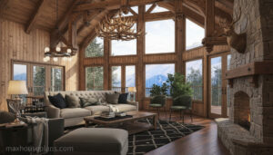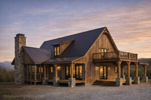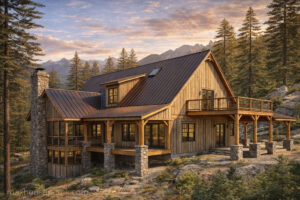 Our Boulder Mountain Cabin house plan is a A-frame cabin plan with an open layout. This plan features a stunning exterior with rustic elements and craftsman details that really makes the home stand out in a mountain or lake setting. You enter the front porch to a vaulted great room with a large a-framed wall of windows to take advantage of your views. An open porch wraps around the cabin allowing you to take in the views from multiple angles of the cabin. On the upper level you will find two bedrooms, one which has sliding barn doors looking into the great room below. The lower level features a recreation room, ample storage space and access to the outside covered porch.