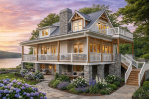 sloping lot, narrow lotLake Glenville Cottage is a 2 story 4 bedroom rustic waterfront cottage style house plan with a wraparound porch, screened in porch and grill deck. It will work great on a narrow or sloping lot at the lake or in the mountains. The master suite is located on the main level and there are two bedrooms on the upper level as well as an upper deck. The wraparound porch and upper deck will allow you to enjoy the views of the lake and your lot from many different view points.