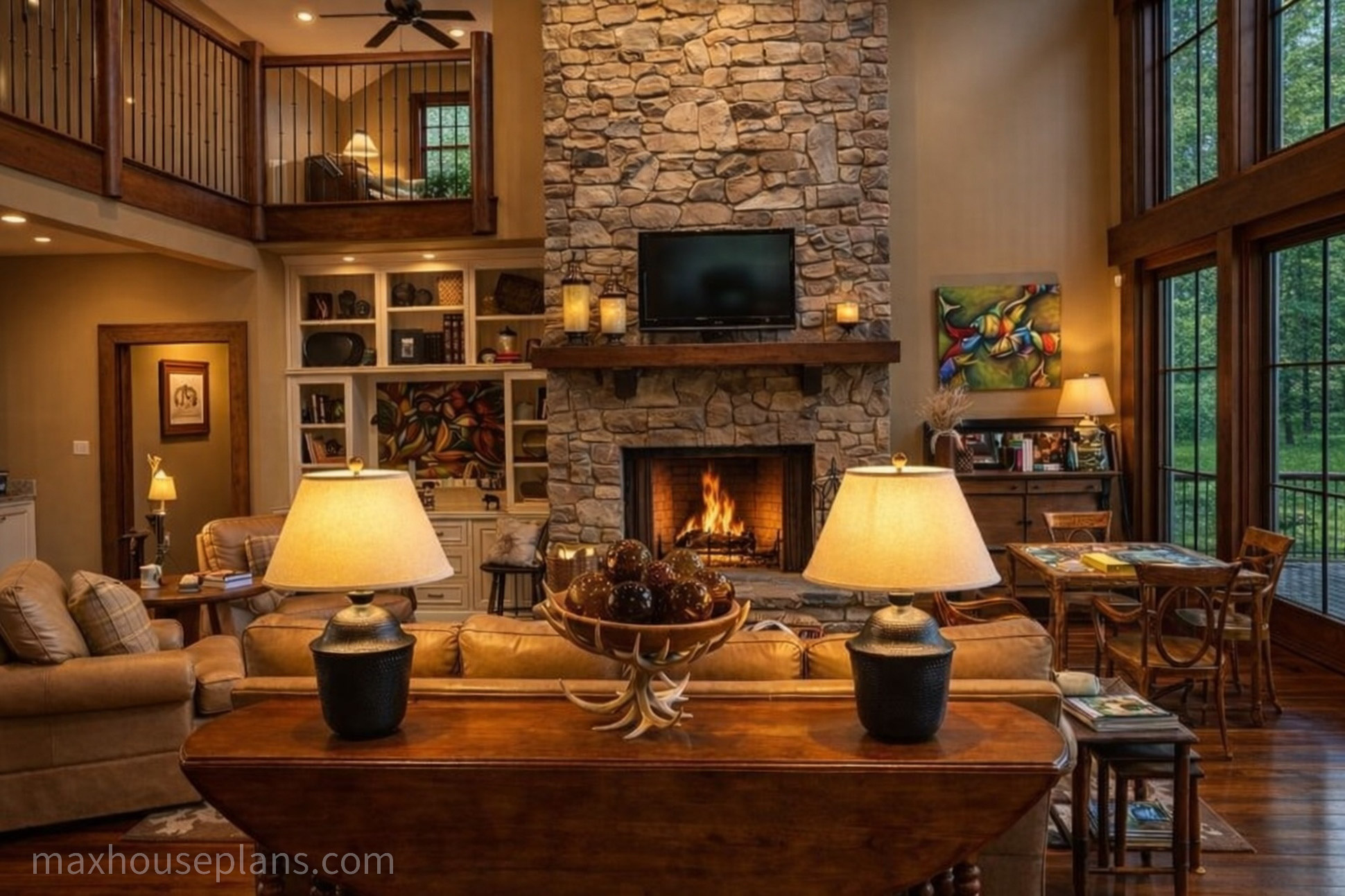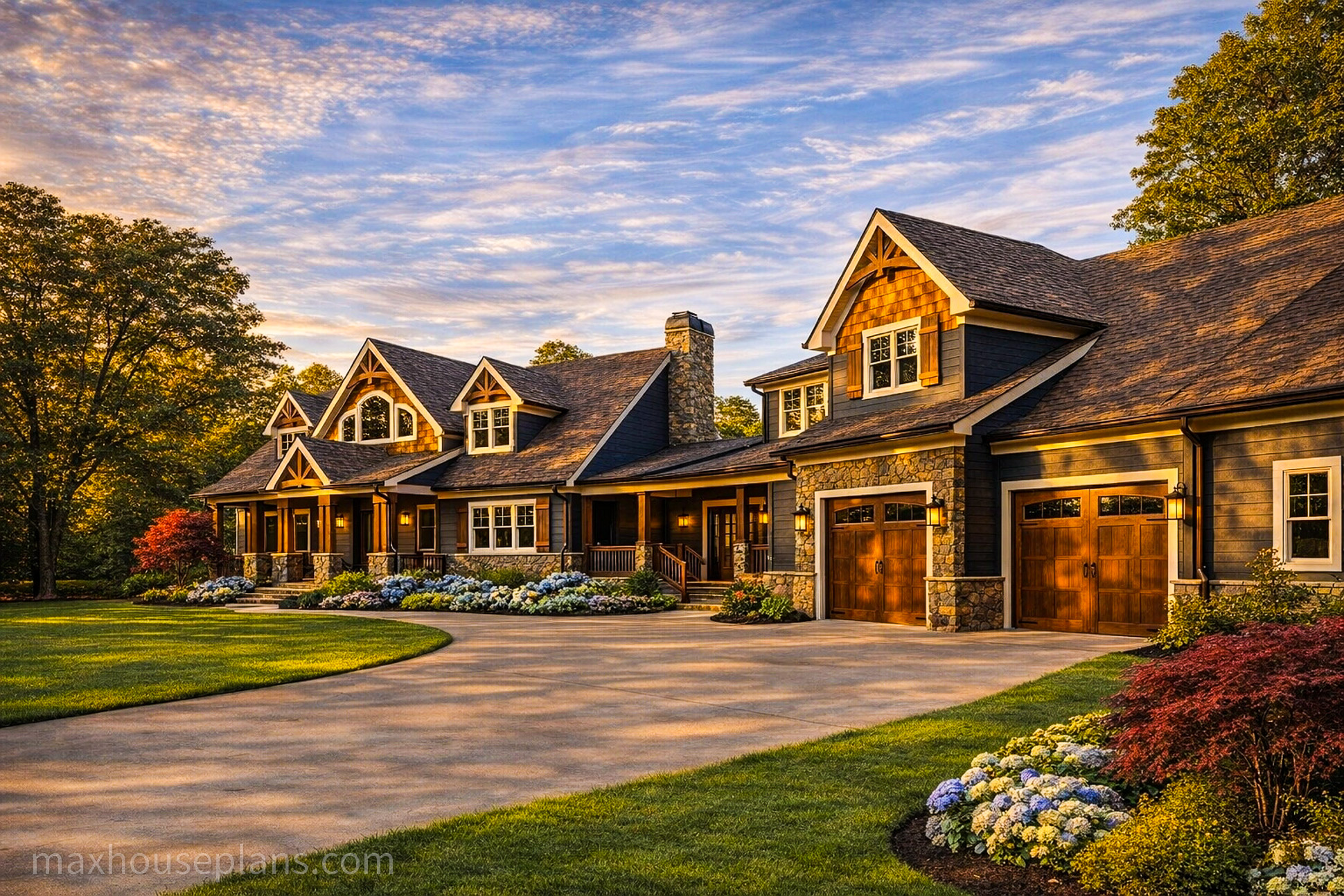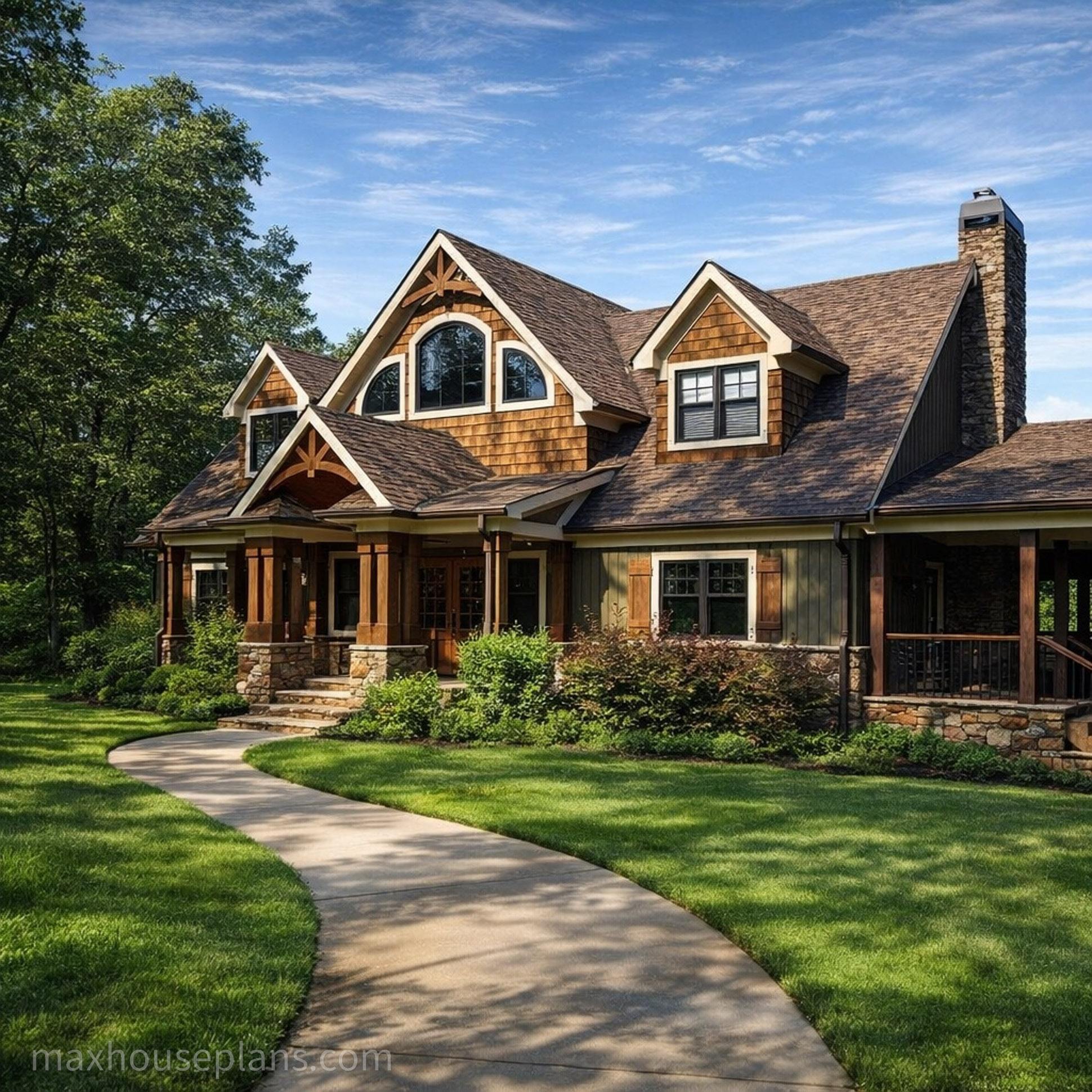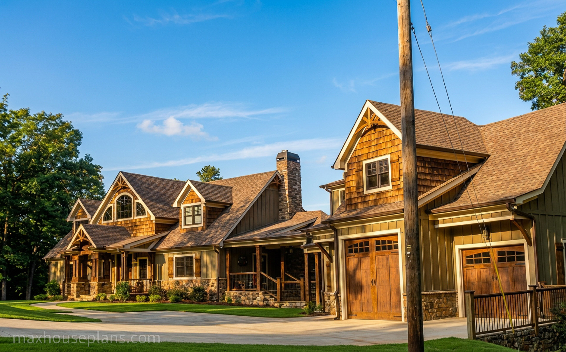 A front porch, screened porch, breezeway, deck, and covered patio give you outdoor living on every side. The bridge to the detached guest garage at 42 by 29 feet is a standout feature that provides serious vehicle and storage capacity while keeping the main home focused on living. At 76 feet wide by 52 feet deep on sloping lake or mountain lots, this lodge commands its site with the presence of a much larger home.