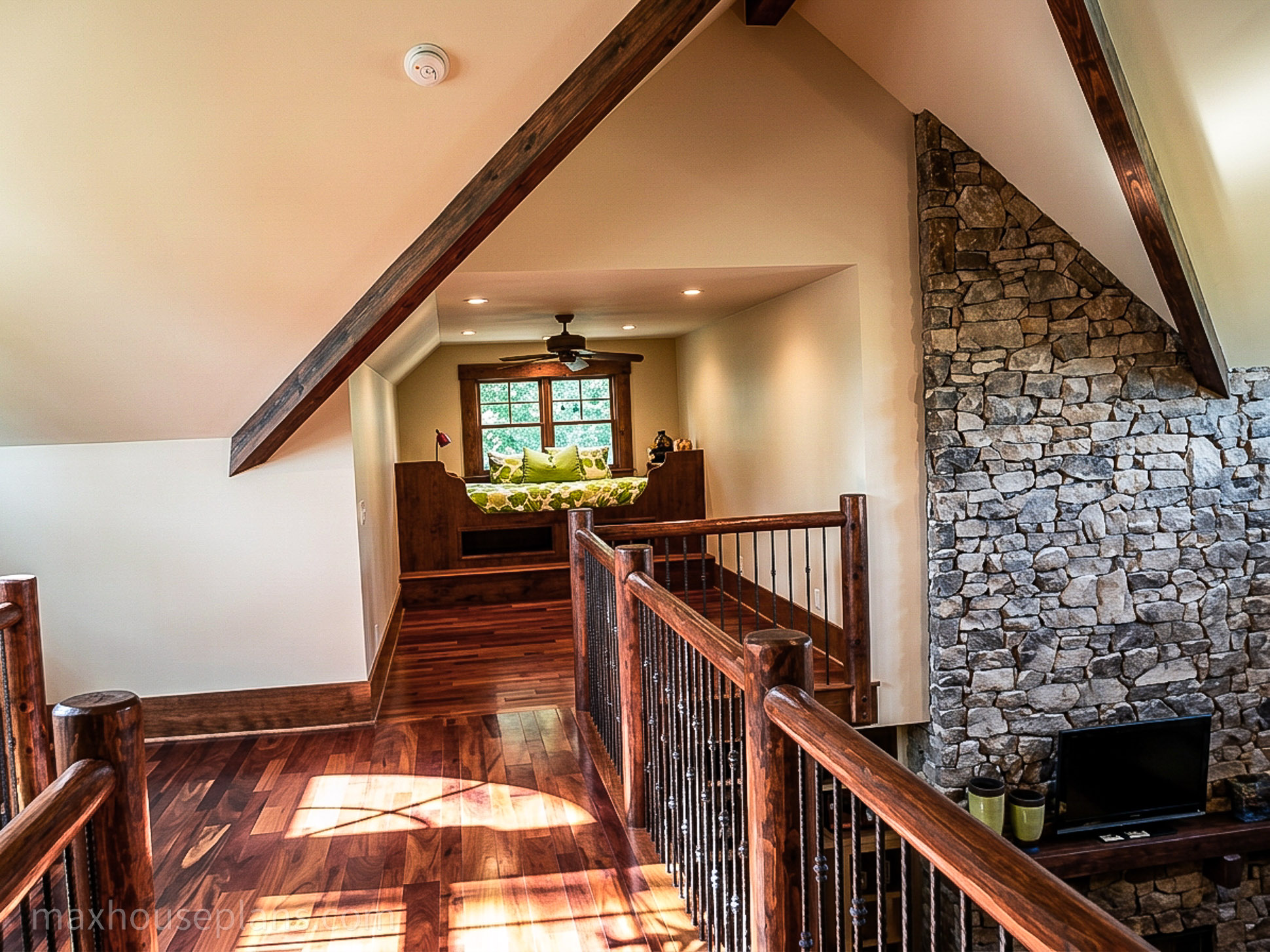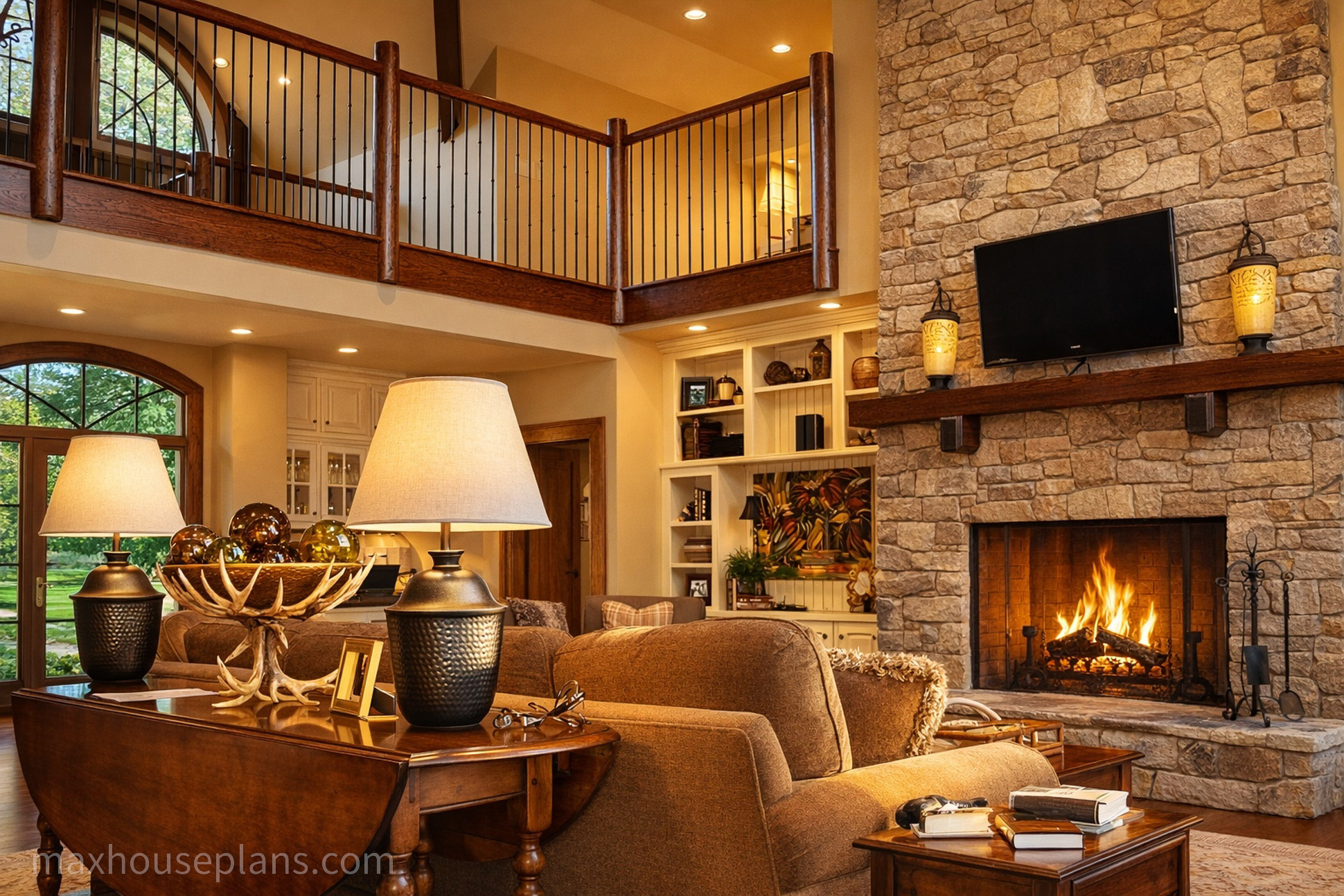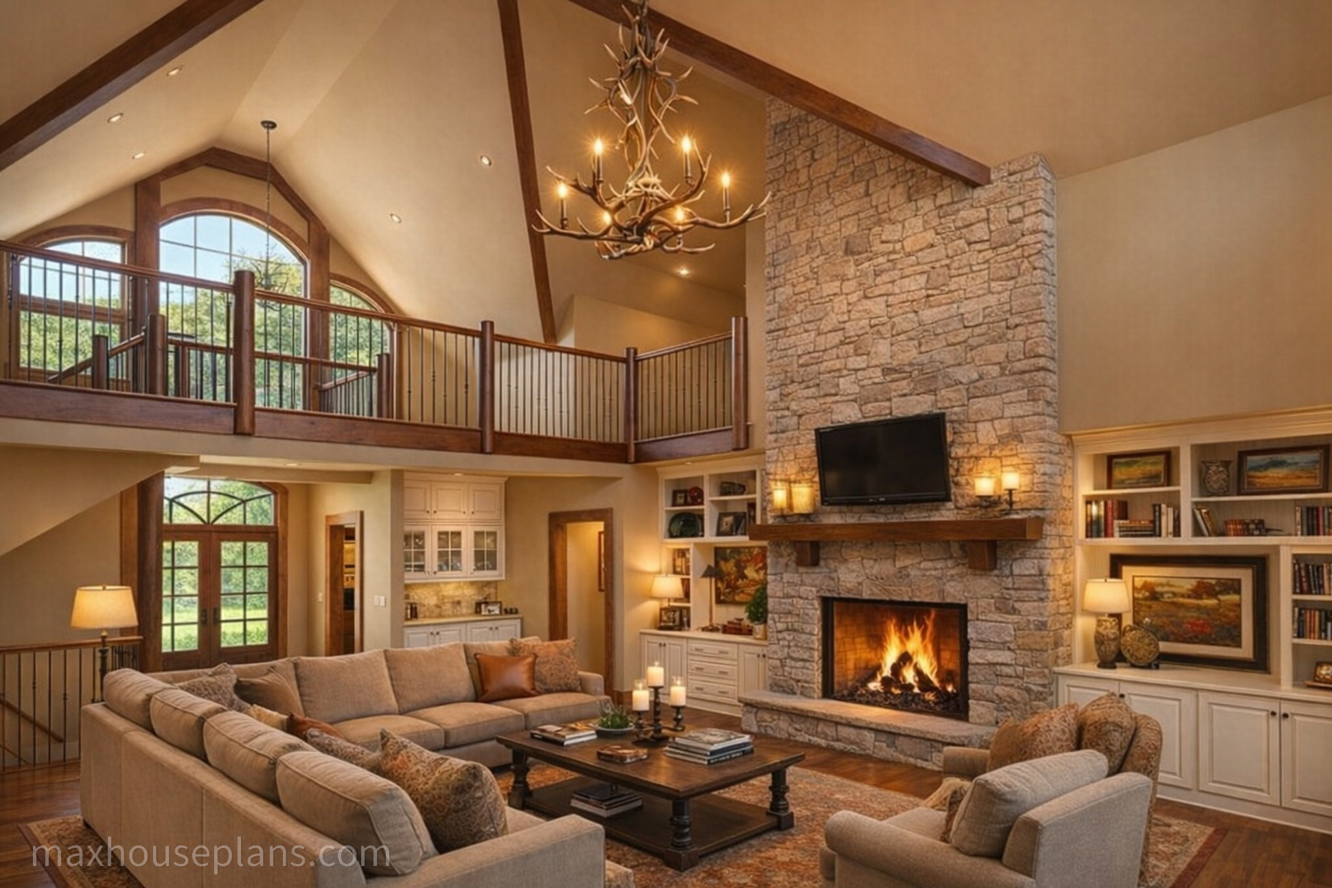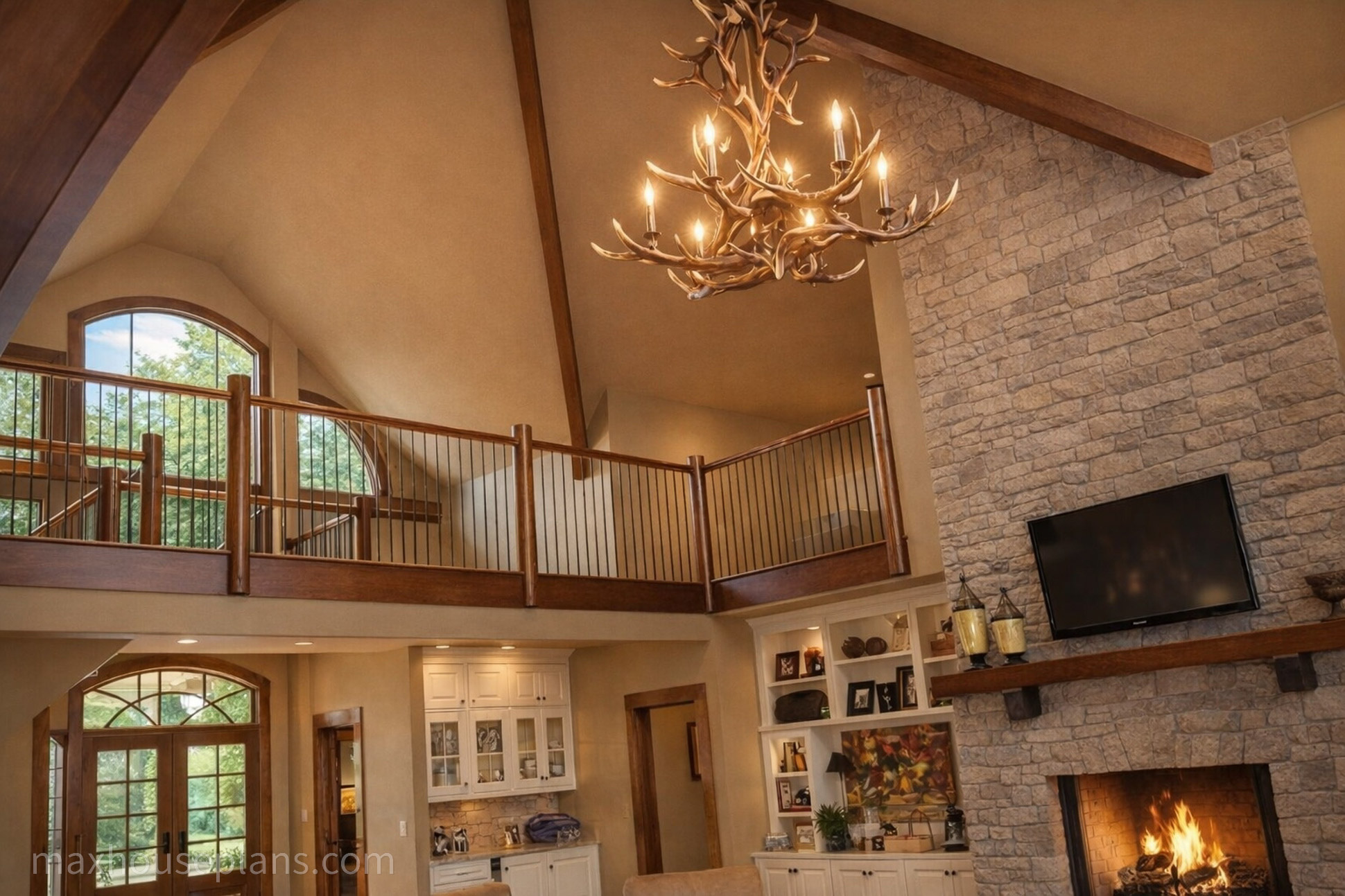 A front porch, screened porch, breezeway, deck, and covered patio give you outdoor living on every side. The bridge to the detached guest garage at 42 by 29 feet is a standout feature that provides serious vehicle and storage capacity while keeping the main home focused on living. At 76 feet wide by 52 feet deep on sloping lake or mountain lots, this lodge commands its site with the presence of a much larger home.
